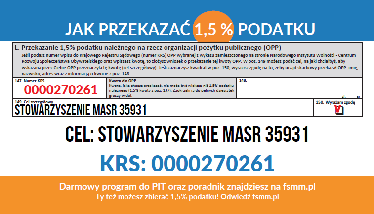 • przekazując 1.5% podatku od dochodów osobistych przy okazji rozliczenia rocznego; wpisując numer KRS 0000270261 oraz podając jako cel szczegółowy „STOWARZYSZENIE MASR 35931” i zaznaczając opcję „Wyrażam zgodę” zgodnie z poniższym przykładem